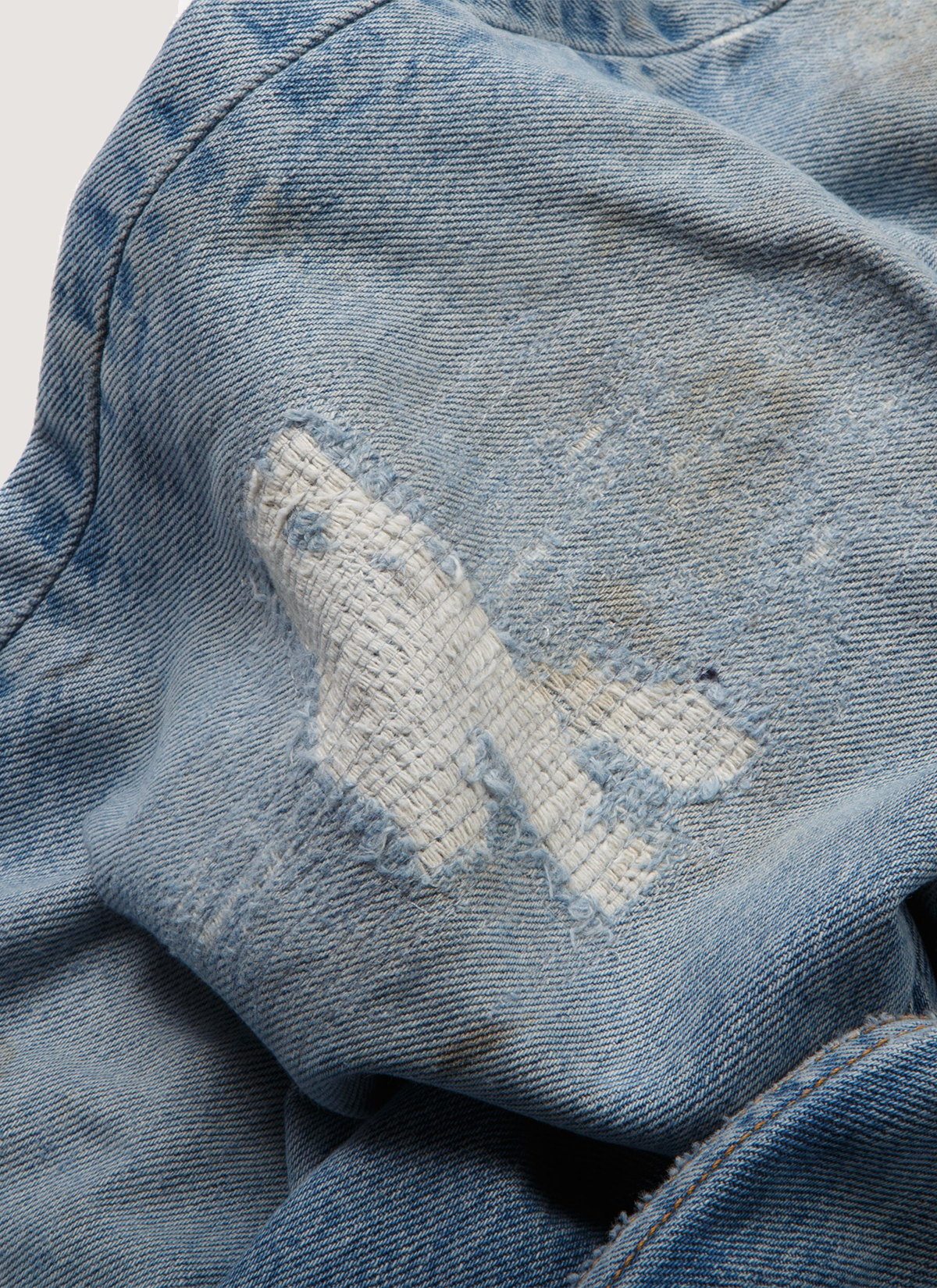 Hand distressed, repaired, and washed